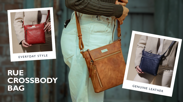 'RUE' Black Pebble Grain Real Leather Crossbody Bag